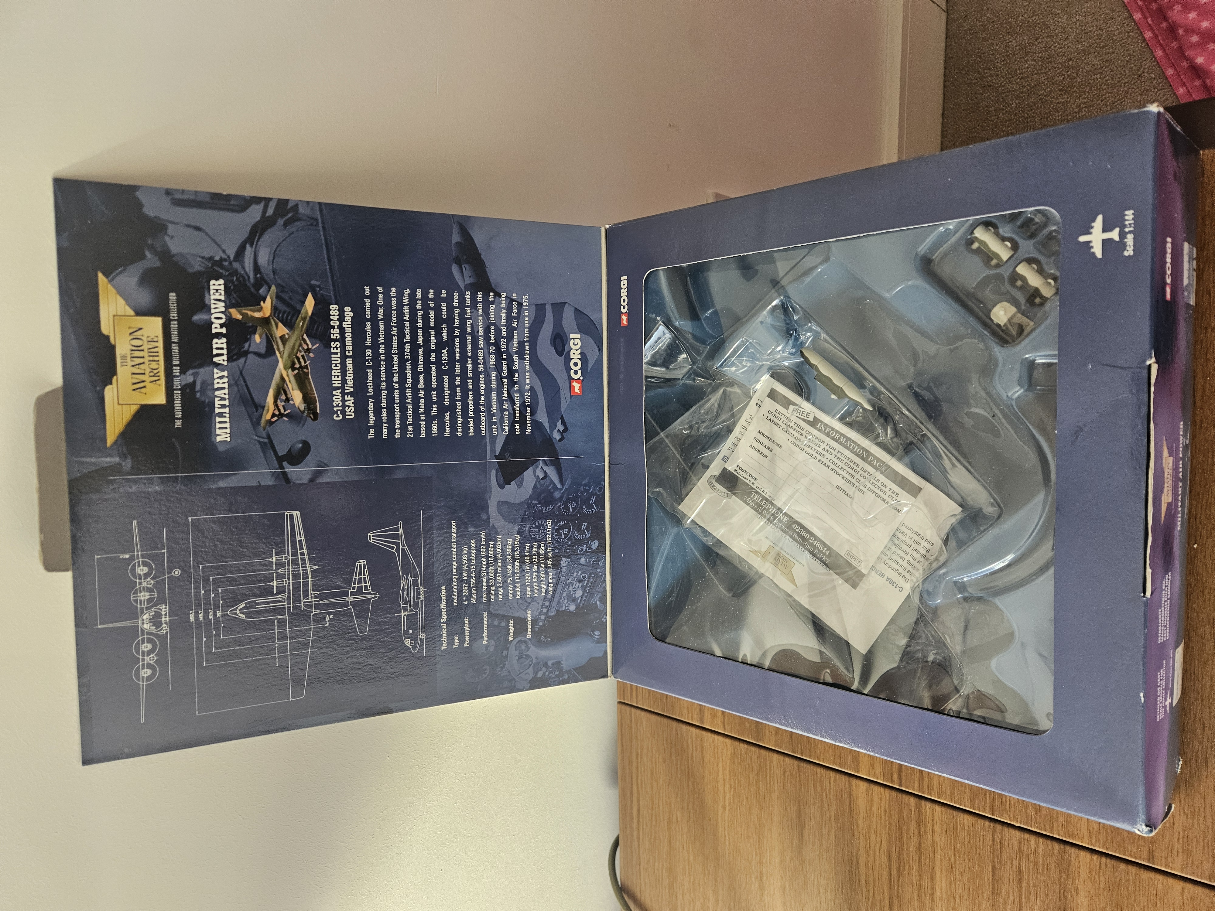 C130 Hercules 56-0489 USAF Vietnam Camouflage. 1.144 scale, Boxed, ( boxed has slight damage) Great looking model, Stand, accessories. Wheels. Made by Corgi.