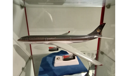 Royal Jordanian Airbus A340, 29cm, great looking model. Has a small amount of broken wing tip on port side. See photo. No box, stand slightly loose on stem. Plastic model.